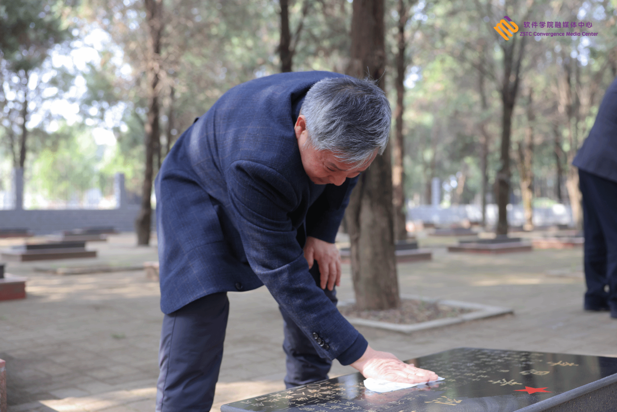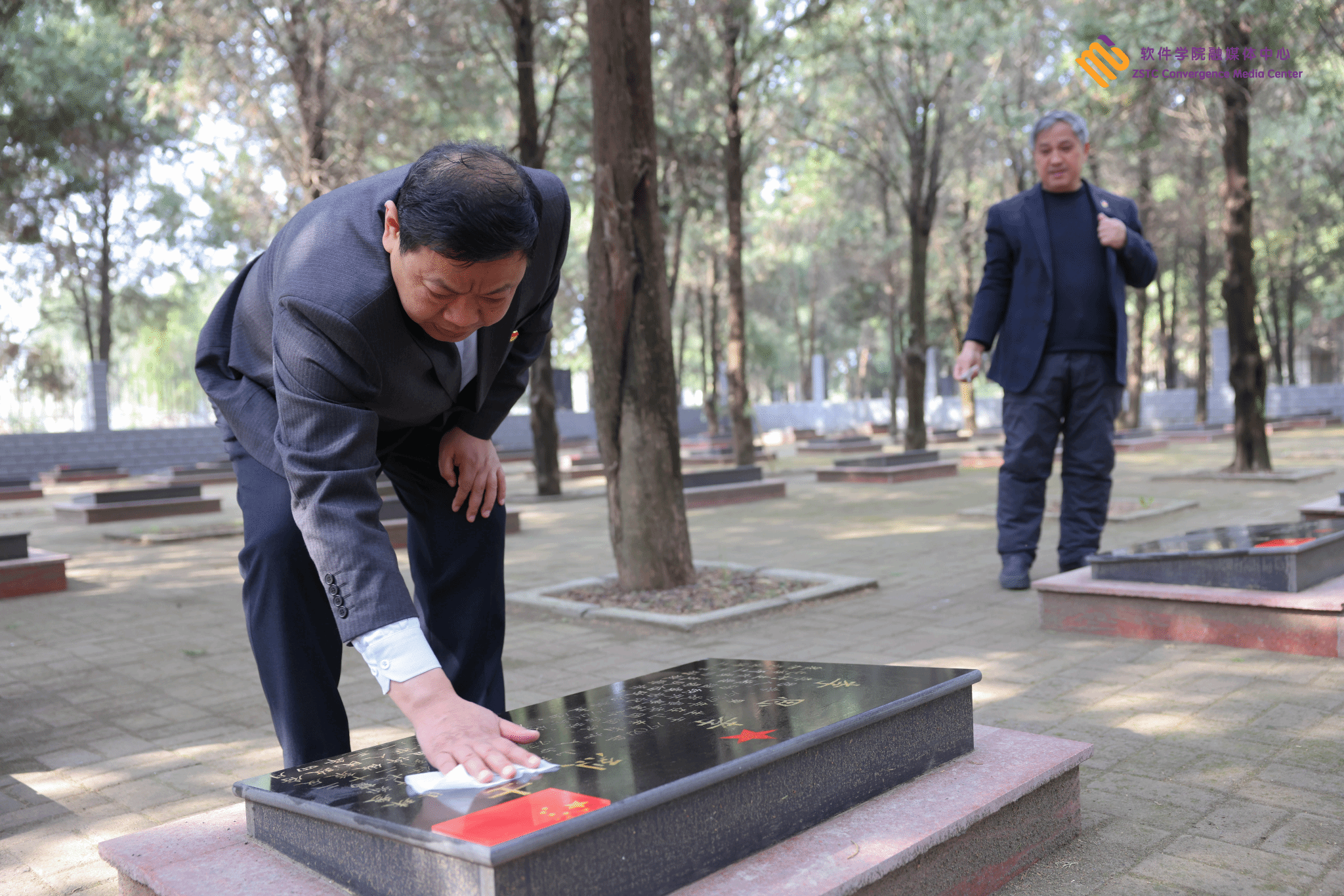 演讲完毕🧙♂️,党员同志们仔细清扫烈士陵园的落叶杂物,清除角落的杂草,擦洗烈士墓碑。
