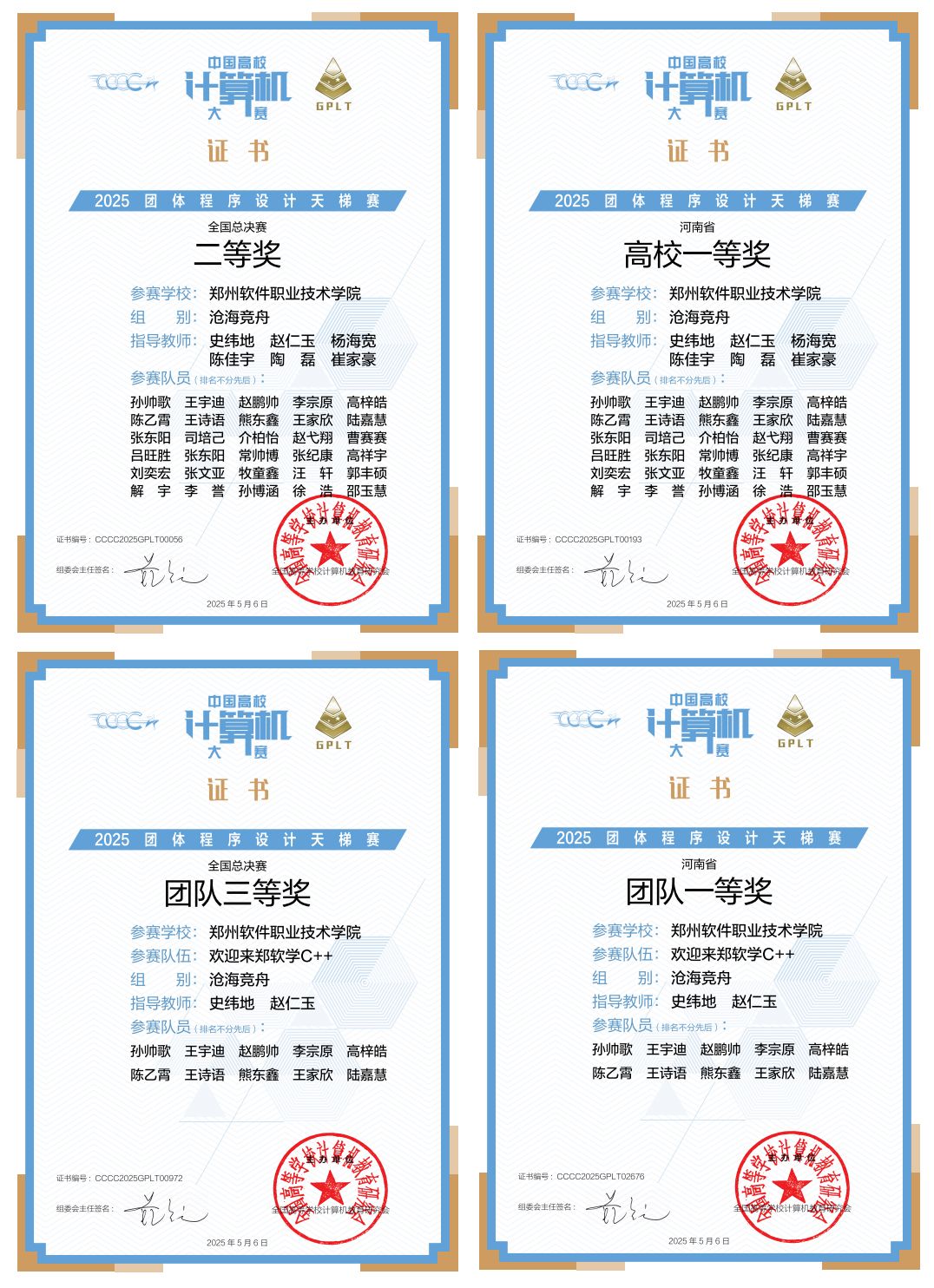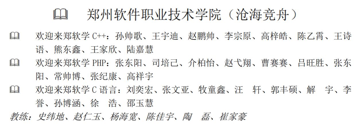 由史纬地🧑🎤、赵仁玉🦸、杨海宽、陈佳宇、陶磊👩✈️、崔家豪老师指导的代表队取得“沧海竞舟”组全国总决赛高校二等奖🖱,河南省高校一等奖的好成绩。其中史纬地🤹、赵仁玉老师带领的“欢迎来郑软学C++”队荣获全国团队三等奖🏋🏻♀️、河南省团队一等奖;杨海宽、陈佳宇老师带领的“欢迎来郑软学PHP”队荣获河南省团队一等奖;陶磊👨🌾🔹、崔家豪老师带领的“欢迎来郑软学C语言”队荣获河南省团队二等奖。