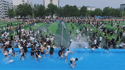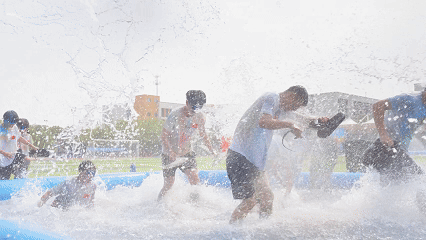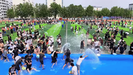 同一时间,校园泼水大作战活动在足球场南北两侧火热开战💇🏼。随着倒计时结束,首场对决正式打响🚦🤦🏽,蓄势待发的同学们手持水枪、水盆冲向"战场",各专业战队展开激烈“水战”,专业大旗迎风挥舞,助威声此起彼伏。学生们在限定场地内尽情泼洒,清凉的水花与飞扬的青春交织,运动场瞬间化作水的海洋现场充满活力与激情。