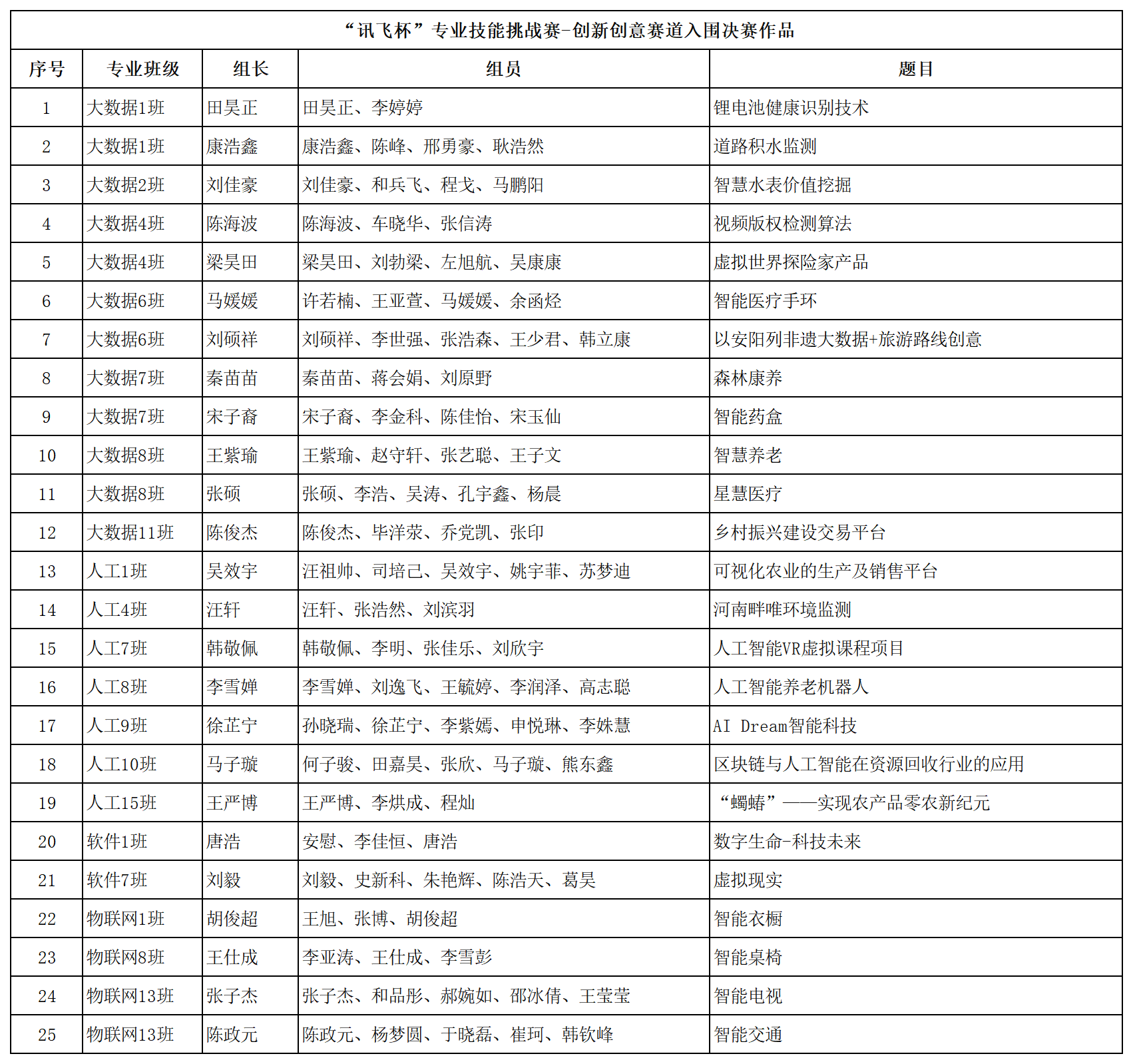彩神第一届“讯飞杯”大学生专业技能挑战赛——创新创意赛道🙈,初赛共有332人🧍,报名总计80组,提交有效作品68个,竞赛组委会本着公正、公平、公开的原则,根据学生参赛提交的策划书PPT,评选出25个优秀作品,进入校内总决赛。现将决赛安排通知如下: