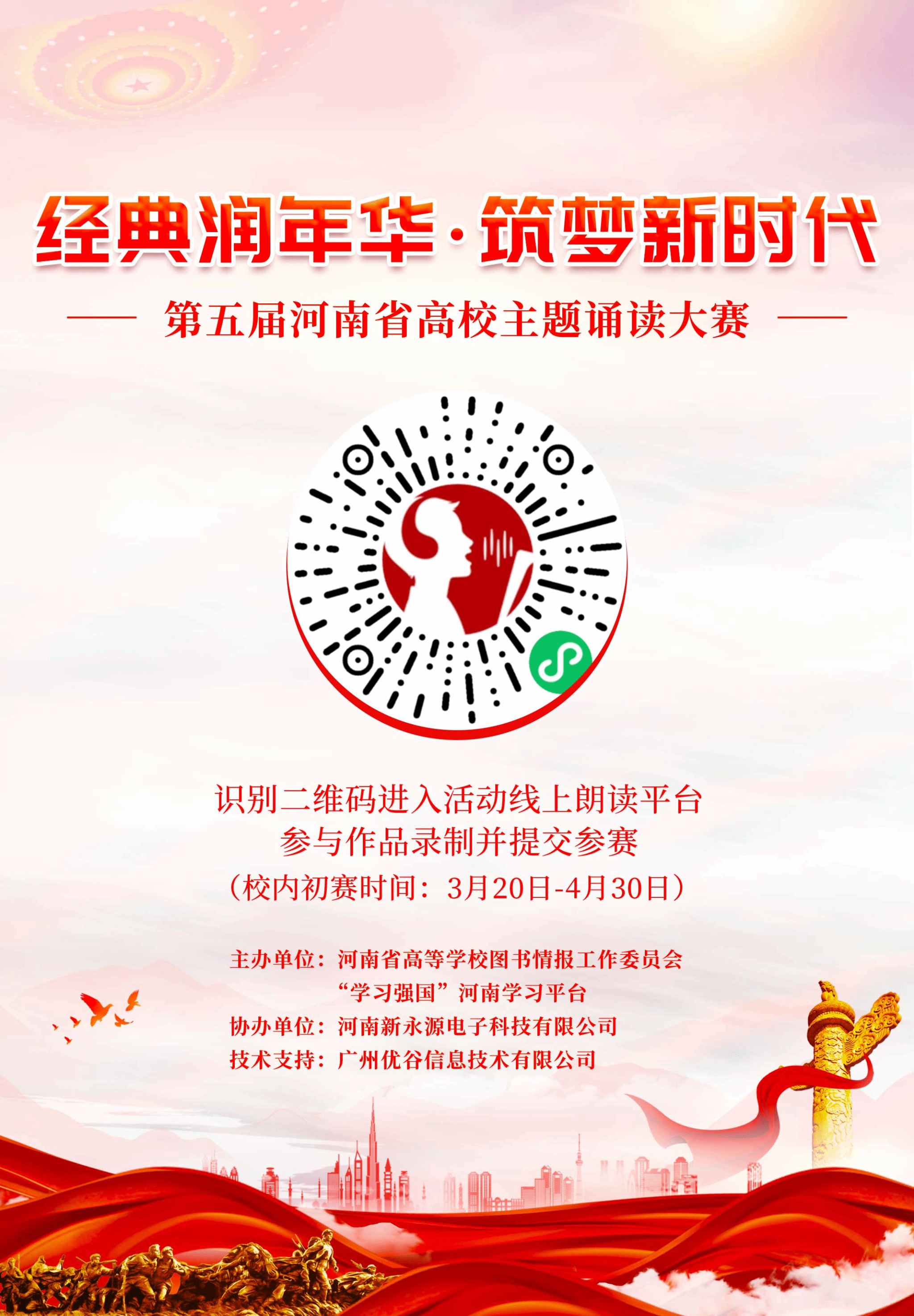 为深入贯彻落实习近平新时代中国特色社会主义思想✬,践行党的二十大精神,庆祝新中国成立75周年,纪念红军长征胜利90周年⇾,在第29个“世界读书日”(4月23日)来临之际🏊🏻‍♀️,河南省高等学校图书情报工作委员会将举办第五届河南省高校“经典润年华·筑梦新时代”主题诵读大赛,现将有关事项通知如下: