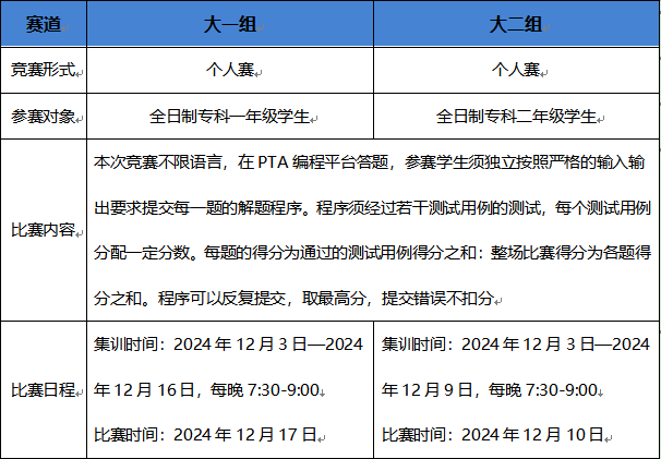 为顺利开展编程竞赛赛道,参赛学生需在2024年12月8日前进入报名群完成报名。比赛分为大一组和大二组,分别于2024年12月10日和12月17日下午14:30-17:30在四号教学楼指定机房进行现场编程👨🏻🦼。