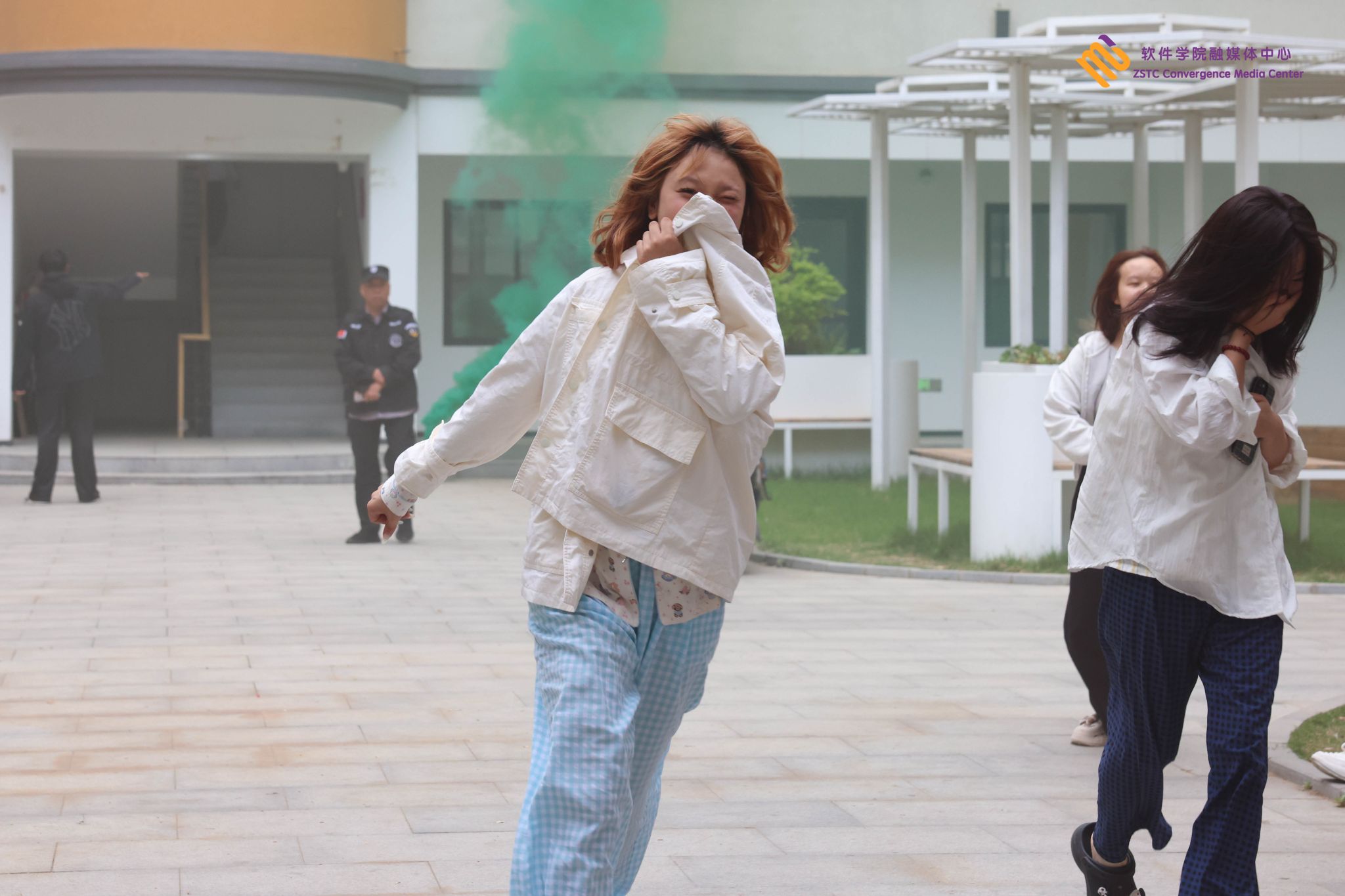 上午7时🧑🏻‍💼,演练正式启动💐👼🏿。工作人员在5号楼209房间、6号楼311房间及连廊处触发烟雾弹模拟火情,消防警报随即响彻公寓。宿舍管理员迅速反应,吹响紧急口哨并上报火情,同时打开所有通道门锁,组织学生撤离。各楼层值班教师按预案分工🙆🏻‍♀️,引导学生沿指定路线疏散👨‍👦。5号楼、6号楼学生分批次从连廊楼梯及中间楼梯撤离🧗‍♂️,全程保持安静、有序🙌🏻,避免推挤。