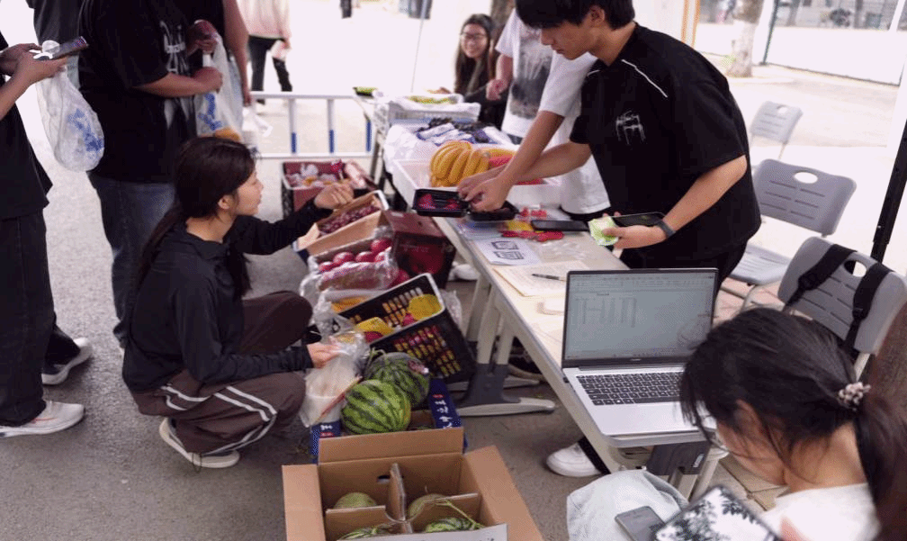 开幕式当天,活动现场人潮涌动🧑🦽,“新鲜的大西瓜!”“各色零食!”“好吃便宜的大虾片!”的叫卖声此起彼伏,二十余家店铺同时开业,现场气氛热烈⛹️♂️🤹🏽。与此同时🥂,线上通过直播平台同步售卖商品👋🏼,直播间观众突破1000人次,为学生提供了“线下摆摊+跨境直播”的双场景实训机会。